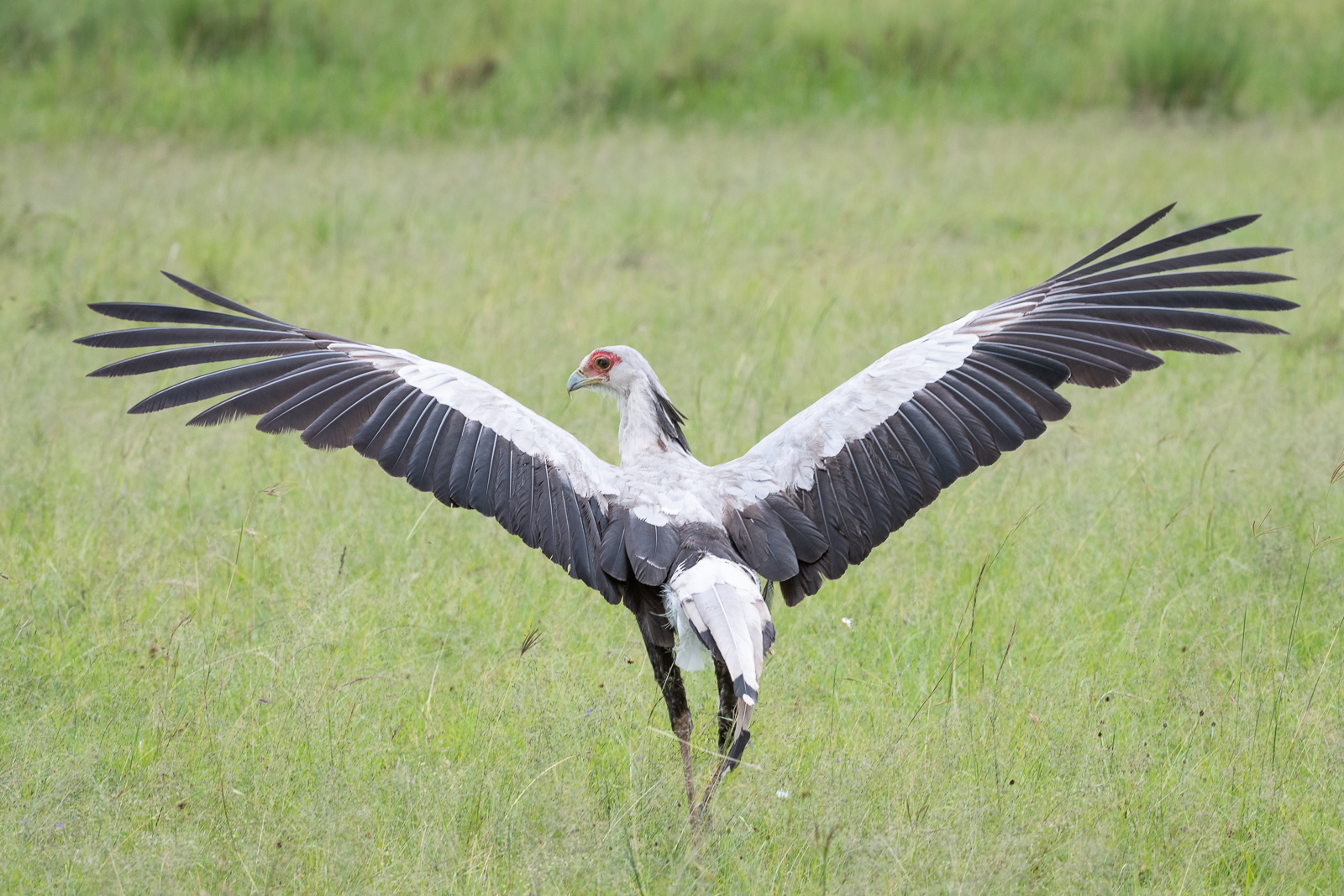 A secretary bird displays its wings as it prepares to take off. Secretary birds are one of the taller flying birds encountered on east African safaris. They spend lots of time on the ground, but also enjoy perching on top of acacia trees. Nikon D500 with Nikkor 200-400mm lens (at 220mm) ISO 400, f/8 at 1/800th of a second.