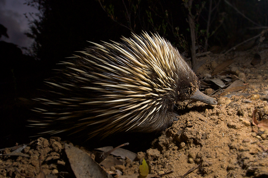This spiny little creature is called a short-beaked echidna. It was photographed early one evening in Flinders Chase National Park on Kangaroo Island in South Australia. Echidnas are monotremes, meaning they are mammals that lay eggs. The only other surviving monotreme is the platypus. Nikon D200 with Nikkor 17-35mm lens (at 17mm) ISO 400, f/8 at 1/60th of a second, Nikon SB-800 flash