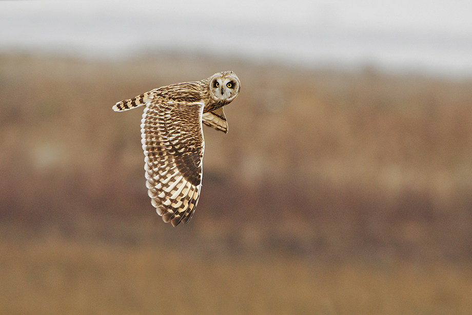 While short eared owls are in flight, they look around a lot, always scanning the landscape not only for dinner, but also for danger. They are small owls and their heads turn so quickly that it’s hard to see with the naked eye when they do, but I got quite a few shots like this with the owl’s body going in one direction and the head looking in the other. Nikon D800 with Nikkor 200-400mm lens (at 400mm) ISO 1250, f/5 at 1/1000th of a second