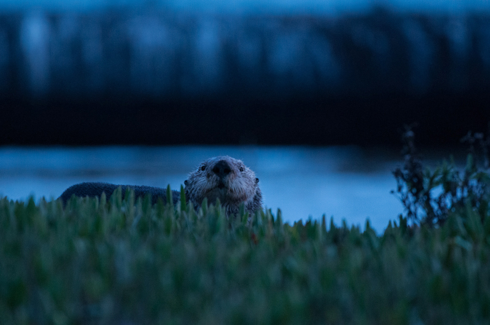 Sea otters spend the vast majority of their time at sea. That said, they often sleep on land. I arrived at this location well before the sun came up and caught this guy just as he was waking up. I used a slow shutter and high ISO to capture what little available light there was. Nikon D300 with Nikkor 200-400mm lens (at 400mm) ISO 1600, f/4 at 1/20th of a second.