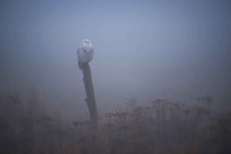 The pre-dawn mist created a nice atmospheric setting for this snowy owl perched on a tree stump. This was from the trip a few winters back in Boundary Bay, just south of Vancouver. About twenty three owls were overwintering in the area after migrating down from parts further north. Nikon D800 with Nikkor 200-400mm lens (at 400mm) ISO 1600, f/4 at 1/500th of a second