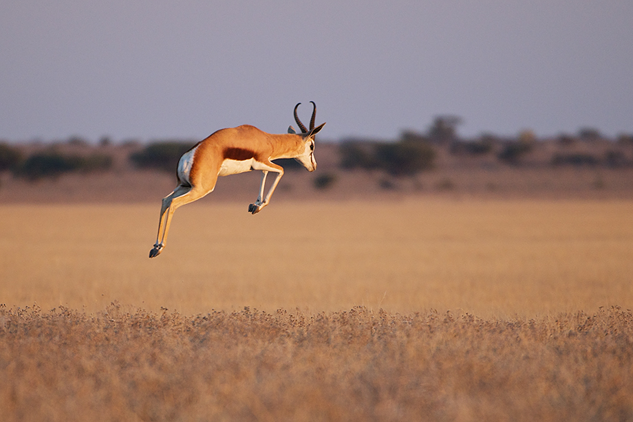 When a springbok pronks like this, it is warning would-be predators not to bother — that it is healthy and not worth the effort to try and catch. I suppose it works sometimes, not others. I photographed this springbok early in the morning in the Central Kalahari Game Reserve of Botswana.