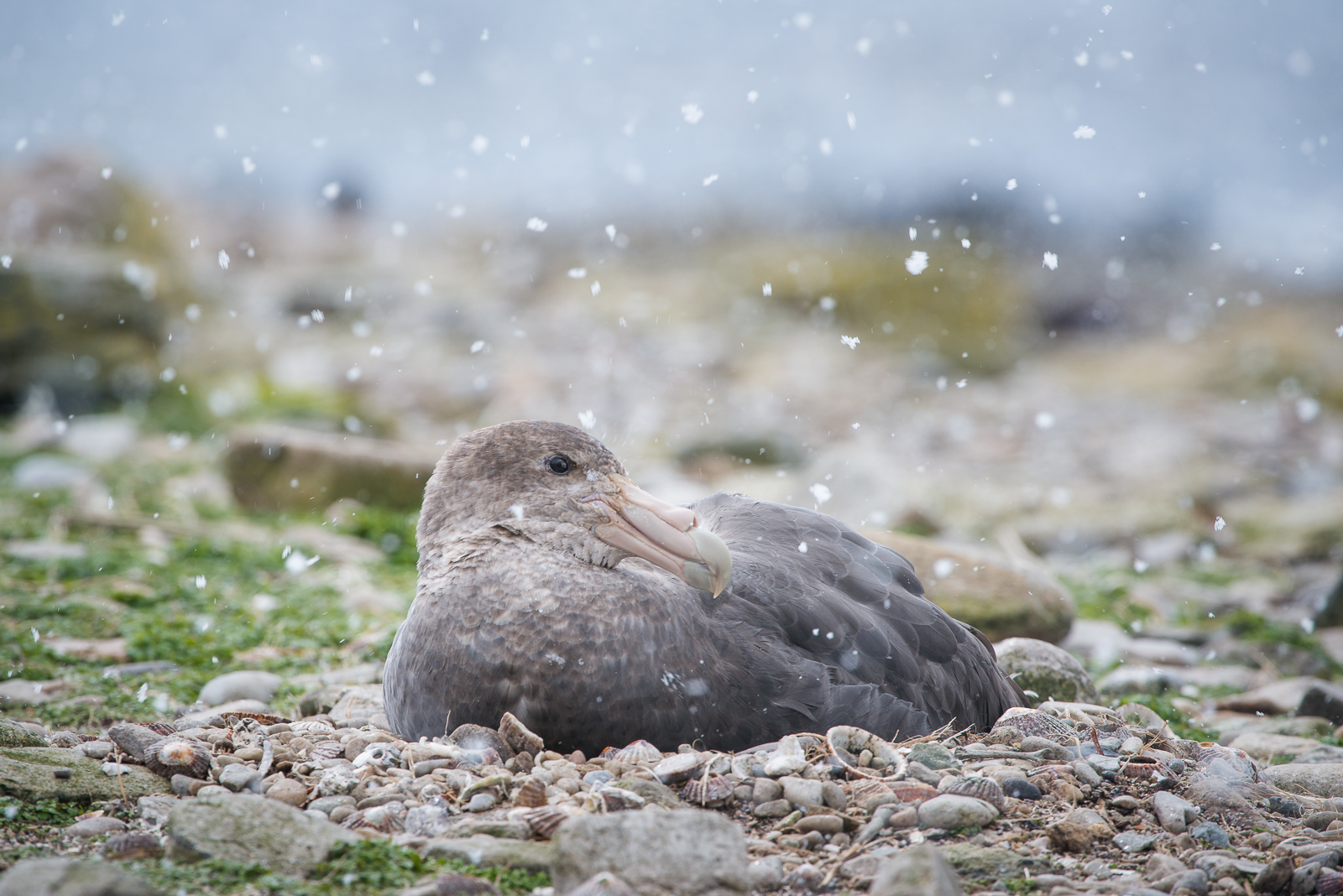 The albatross isn’t the only large seabird with an enormous wingspan to be found in the Falkland Islands. Petrels also call the islands home. Not quite as large as the browed albatross with its eight foot wingspan, the southern petrel measures in at just under seven feet, wingtip to wingtip. This particular southern petrel was nesting on Carcass Island in the Falklands and was sitting on a few eggs. You can see the shells that she used to make her nest. This was taken on a typical day in the Falklands when it was sunny and warm one moment and snowing the next. Nikon D800 with Nikkor 200-400mm lens (at 400mm) ISO 400, f/6.3 at 1/500th of a second
