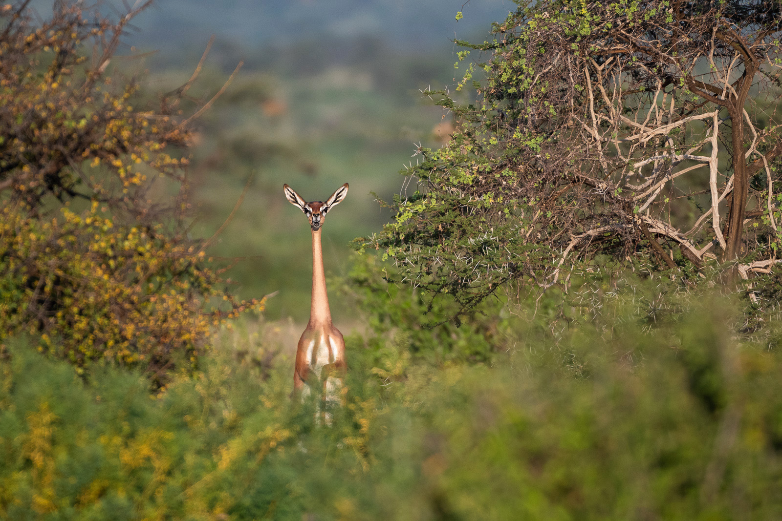Gerenuk’s are known for their long necks — in fact, they are commonly called giraffe-necked antelope. At times, they will rear back on their hind legs and stand upright while feeding on higher leaves. This female gerenuk was doing just that before turning to look in our direction. Photographed in Samburu National Reserve in Kenya. Nikon D500 with Nikkor 200-400mm lens (at 400mm) ISO 400, f/4 at 1/1600th of a second.
