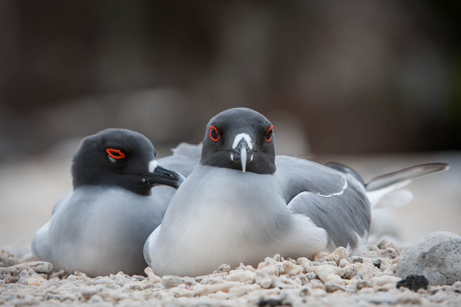 Just a photo of two simple gulls sitting on their coral-y nest. But if I do say, they have spectacular eye rings. And the one looking at camera adds a nice bit of attitude. They are swallow-tailed gulls and they were photographed on Genovesa Island in the Galapagos Islands of Ecuador. Nikon D700 with Nikkor 200-400mm lens (at 300mm) ISO 400, f/6.3 at 1/320th of a second