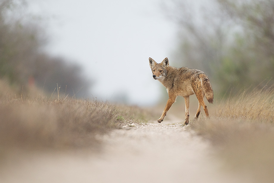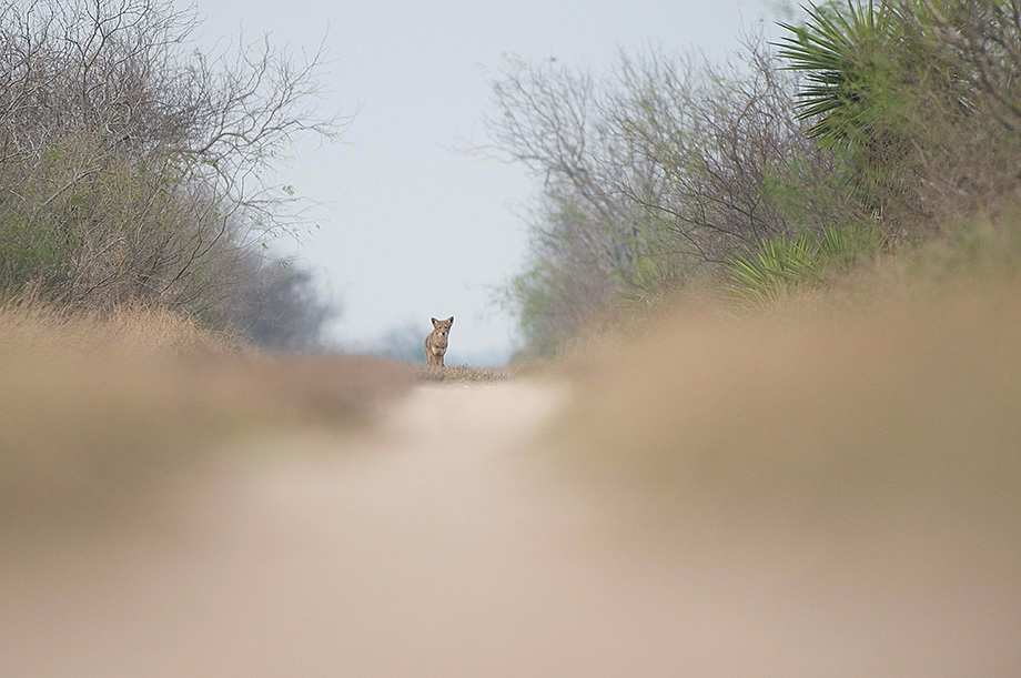 It was first thing in the morning on Sunday when I was out searching for ocelots, hoping I might catch one as it headed home after a night of hunting in Laguna Atascosa National Wildlife Refuge in Texas. At the end of this long path, I spotted something moving and immediately got on the ground not wanting to scare away whatever it was. As it drew a little closer (in the above shot) I could finally make out the tell tale ears of a coyote. It came a little closer still before turning left into the woods. I stayed put and about ten minutes later it eventually reappeared much closer.