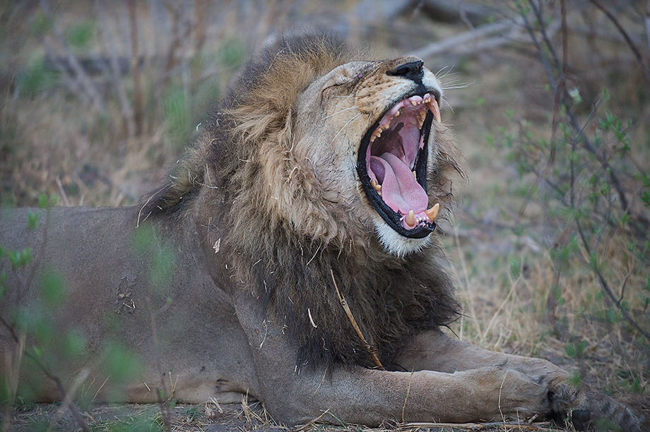 I really felt bad for this poor old boy. He was without a pride and trapped between the territories of two other prides. Apparently, he gets beat up a lot when he wanders too far north or south and into those other territories. Luckily, he did have a wildebeest kill when we came across him and he spent a couple of days near our camp feeding upon it. In this photo, he was letting out a big yawn before heading back to the kill. He was the only lion that we saw on the short Botswana trip. Nikon D700 with Nikkor 70-200mm lens (at 200mm) ISO 3200, f/2.8 at 1/100th of a second