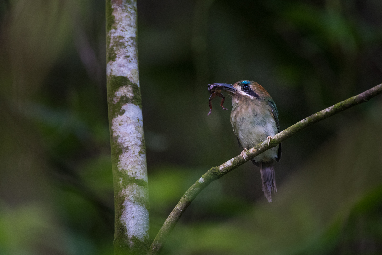 There are four different species of motmot that live in Panama, the smallest and most rare being the tody motmot. I was hoping to simply catch a glimpse of this bird and was doubly rewarded when it showed up with a frog in its beak. The tody motmot is also unique among the motmots in that it lacks the distinctively long tail of the others that usually ends in a racket-like tip. Nikon D810 with Nikkor 200-400mm lens (at 400mm) ISO 1600, f/4 at 1/125th of a second