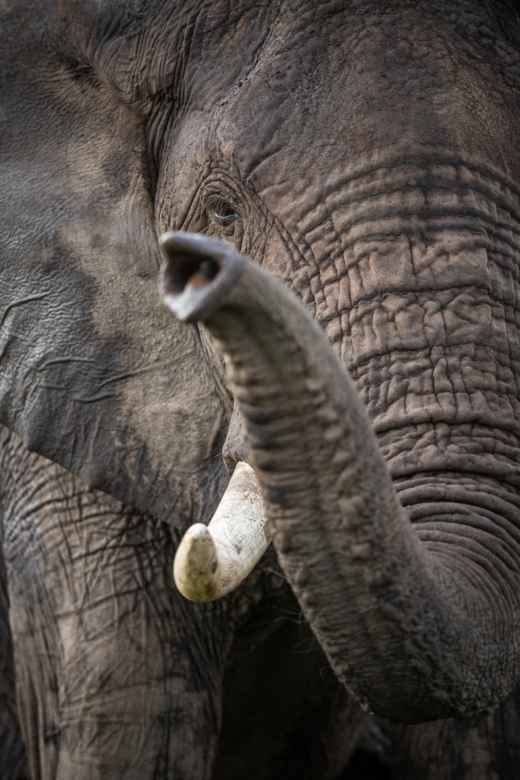 The elephants came very close, giving me the opportunity to try some intimate portraits. I had the focus on the eye for this one, but am wondering if I should have switched it to the tip of the trunk. Either way, some nice texture in there. Photographed in the Maasai Mara of Kenya. Nikon D850 with Nikkor 70-200mm lens (at 180mm) ISO 800, f/2.8 at 1/640th of a second.