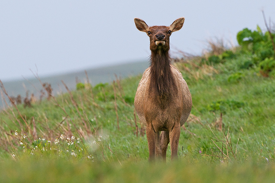 Tule elk are the smallest subspecies of elk in North America. They live only in a few small pockets of California. One of the most reliable places to see them is at Point Reyes National Seashore north of San Francisco. It was getting near the end of the day when I came across a small herd of females, including this young lady who was obviously reacting to a particularly funny joke that I told her.