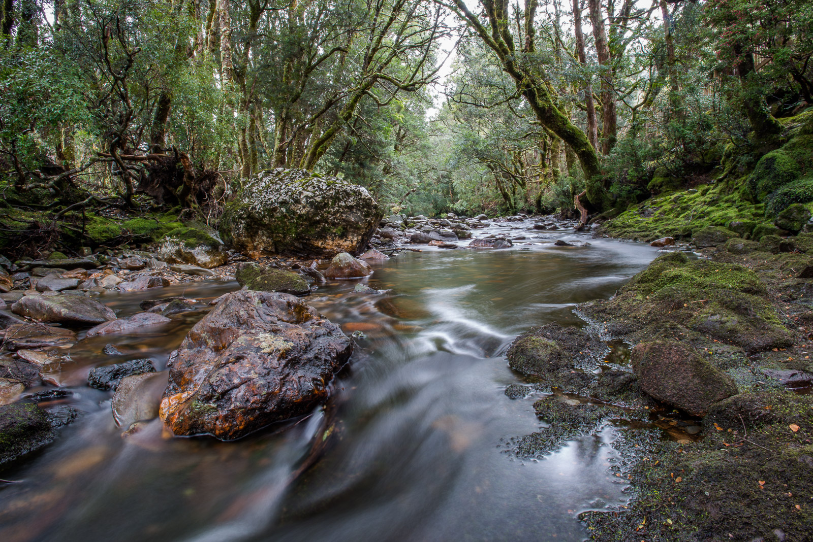 As I mentioned in a previous post, the landscape of Tasmania is extremely diverse — especially for an island that’s only about the size of Georgia or West Virginia. These two photos were taken at Cradle Mountain National Park in the north central mountains. The top shot is a boardwalk along the Waterfalls Walk. The entire track is boardwalk and leads to two waterfalls. The bottom shot is a river along a track appropriately called The Enchanted Walk. Both photos highlight the mossy forest typical of Cradle Mountain. It feels as if dwarves and elves might be hiding just around the corner. Top Photo: Nikon D800 with Nikkor 17-35mm lens (at 17mm) ISO 200, f/18 at 1 second