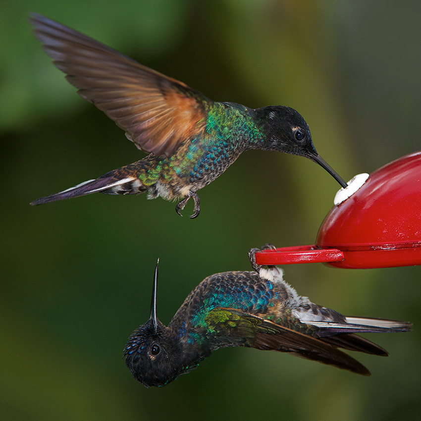 I usually don’t like to post photos that show the hand of man, but every now and again I make an exception. Thus is the case today with these two yin and yang hummingbirds. They are both velvet-purple coronets and they were hanging around a feeder near our cloud forest lodge in Ecuador, along with several other species of hummingbird. Nikon D800 with Nikkor 200-400mm lens (at 350mm) ISO 800, f/4 at 1/1600th of a second, Nikon SB-900 flash