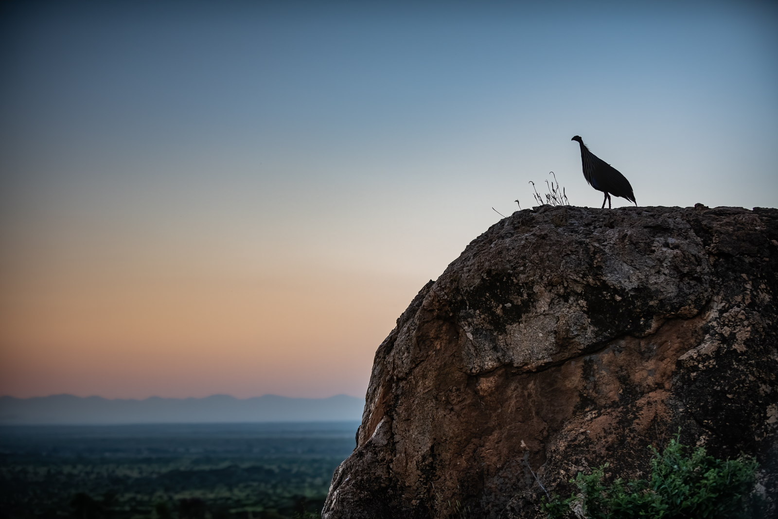I was hoping to get a lion or a leopard up on this rock while the sun rose over the Kenyan landscape, but settled for this guineafowl. These guys were actually pretty cool looking. Tough to tell in this near silhouette, but I’ll post another pic soon. We were up in the foothills of Samburu National Reserve and it was a beautiful morning as the savanna’s diurnal residents were just starting their day. Nikon D850 with Nikkor 70-200mm lens (at 70mm) ISO 1600, f/2.8 at 1/1250th of a second.
