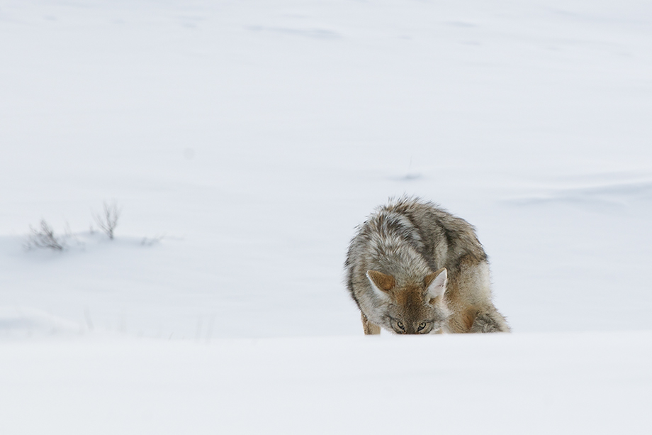 This coyote was working on a carcass that was buried beneath the ridge line of the snow. Perhaps the coyote chanced upon an elk or deer that couldn’t make it through the harsh Yellowstone winter. Or, more likely, wolves had abandoned a kill that subsequently got buried beneath the drifting snow. Either way, the coyote kept a watchful eye on me as it feasted away. Nikon D300 with Nikkor 200-400mm lens (400mm) ISO 400, f/7.1 at 1/640th of a second (plus 1.33 stops ev)
