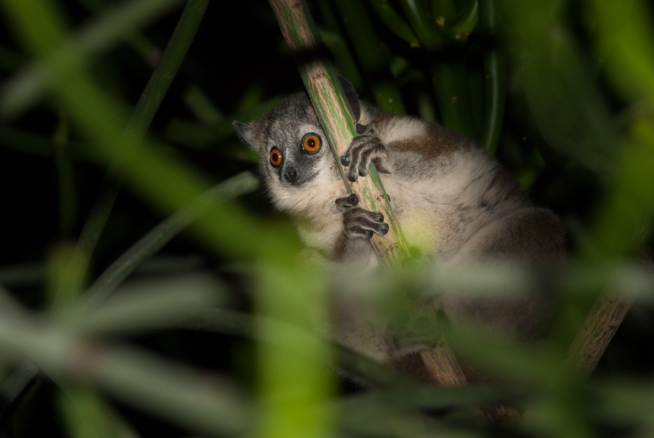 The white footed sportive lemur is just one of the many species of lemur in Madagascar that are nocturnal. Like all lemurs, they are endangered. In the case of the white footed sportive lemurs, habitat loss due to agriculture and charcoal production are the main problems. Fun fact about these lemurs — they are coprophagous, meaning that they consume and reediest their own feces to help breakdown the cellulose in their food (their diet consists almost entirely of leaves). Nikon D200 with Nikkor 80-200mm lens (at 185mm) ISO 200, f/4.5 at 1/60th of a second, two Nikon SB-800 flash units
