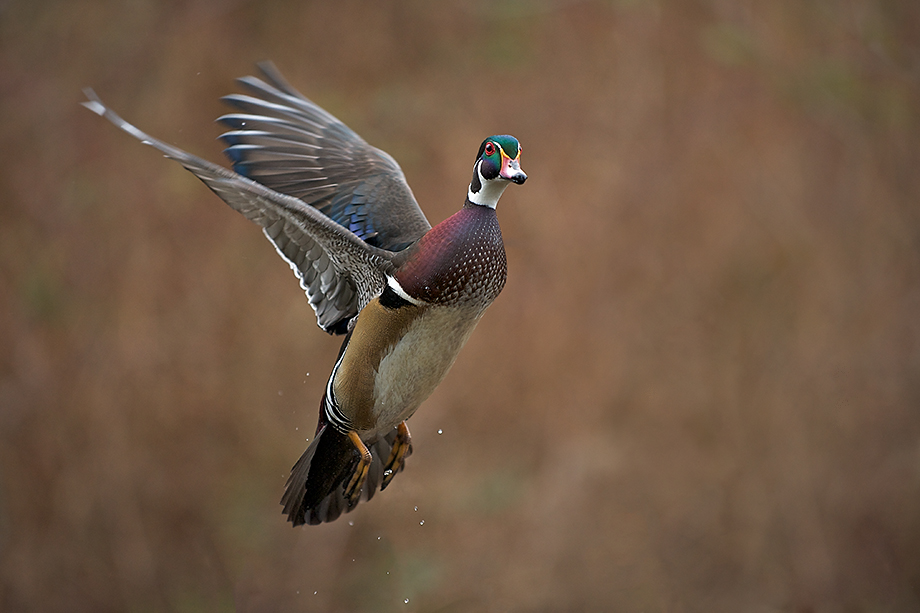 Here’s another wood duck — this time, just after it lifted off from a pond. Wood ducks get their name because they nest in trees. The females will lay 7 to 15 eggs in the tree cavity and the day after hatching, the ducklings will climb to the nest entrance and jump to the ground. Miraculously, they can jump from a height of 290 feet without injury. Even so, the parents will try to find a tree over a body of water so that the landing will be softer than if over the ground. The mother will call to the young ducklings, but they are able to swim and find food on their own by this time. Nikon D700 with Nikkor 70-200mm lens (at 200mm) ISO 800, f/2.8 at 1/1250th of a second