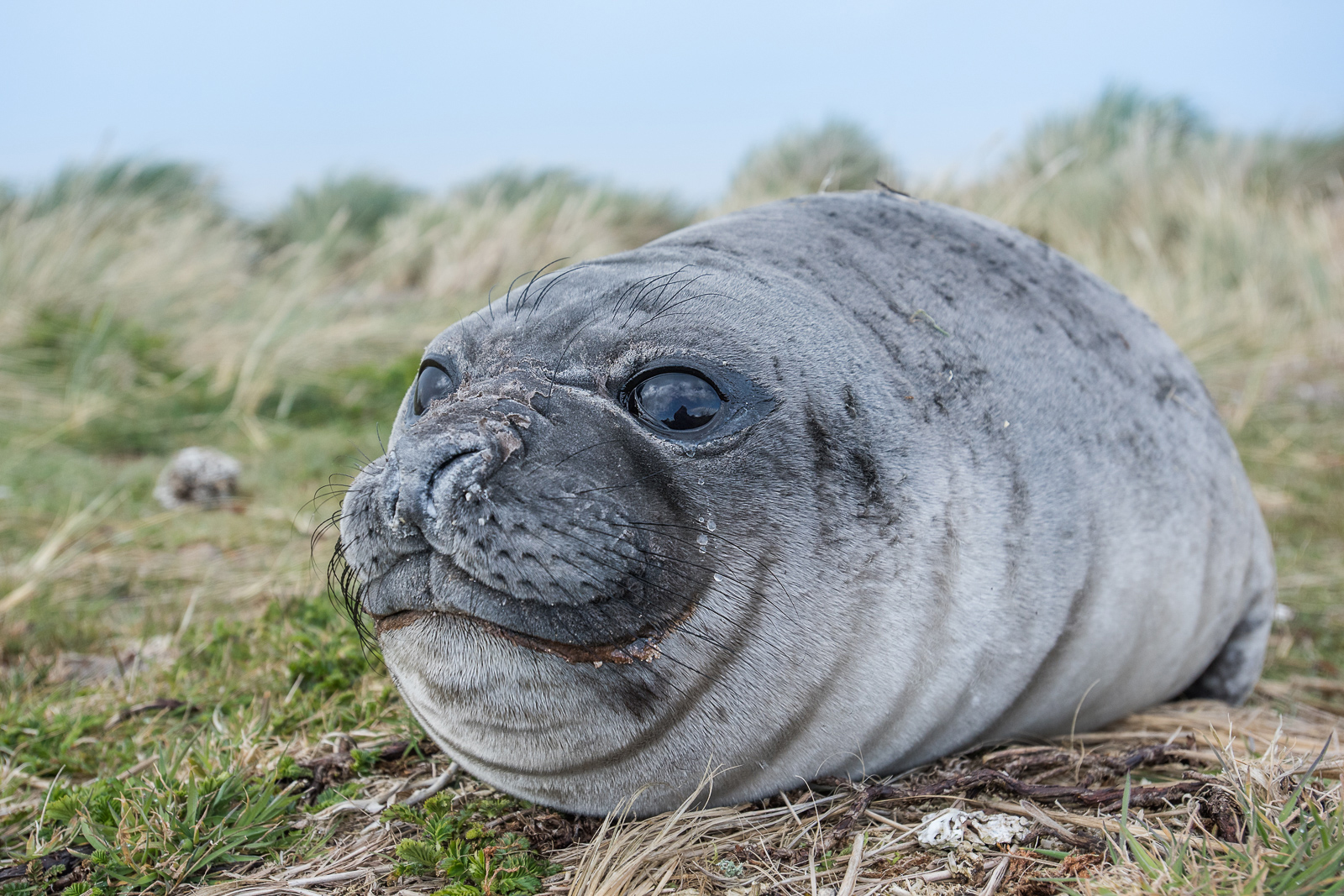 This juvenile southern elephant seal seemed to be shedding a few tears as I snapped its picture. The seal’s eyes, however, were probably just watering from the strong winds that were whipping through the tussock grass on Carcass Island in the Falkland Islands. This was one of those days that the sun was warm and shining one moment and the sky was pelting down frozen rain the next. Typical of an afternoon on the Falklands. Nikon D810 with Nikkor 17-35mm lens (at 35mm) ISO 800, f/6.3 at 1/1000th of a second