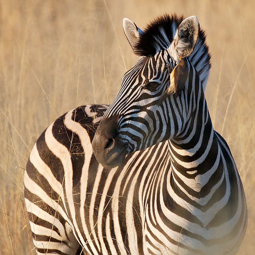 Oxpeckers can be found on most of the large mammals of sub-Sahara Africa including elephants, rhinos, giraffes, buffalo, and in this case, zebras. They mostly eat ticks off the backs of their hosts, but sometimes they move in for a delicious bite of earwax. This zebra/oxpecker combo were photographed early one morning in the Okavango Delta of Botswana.
